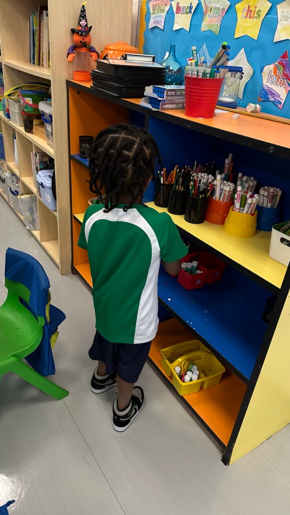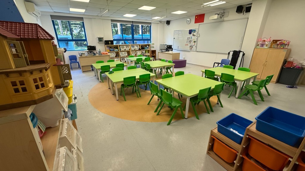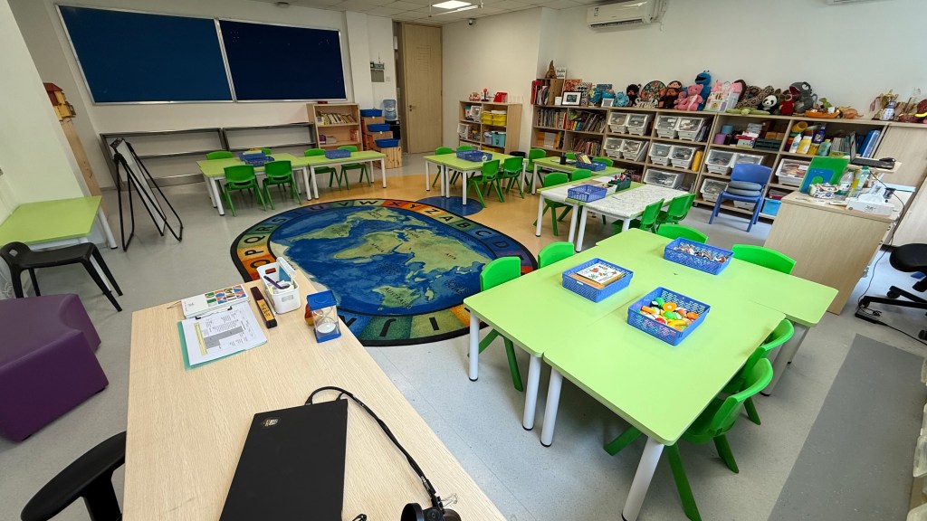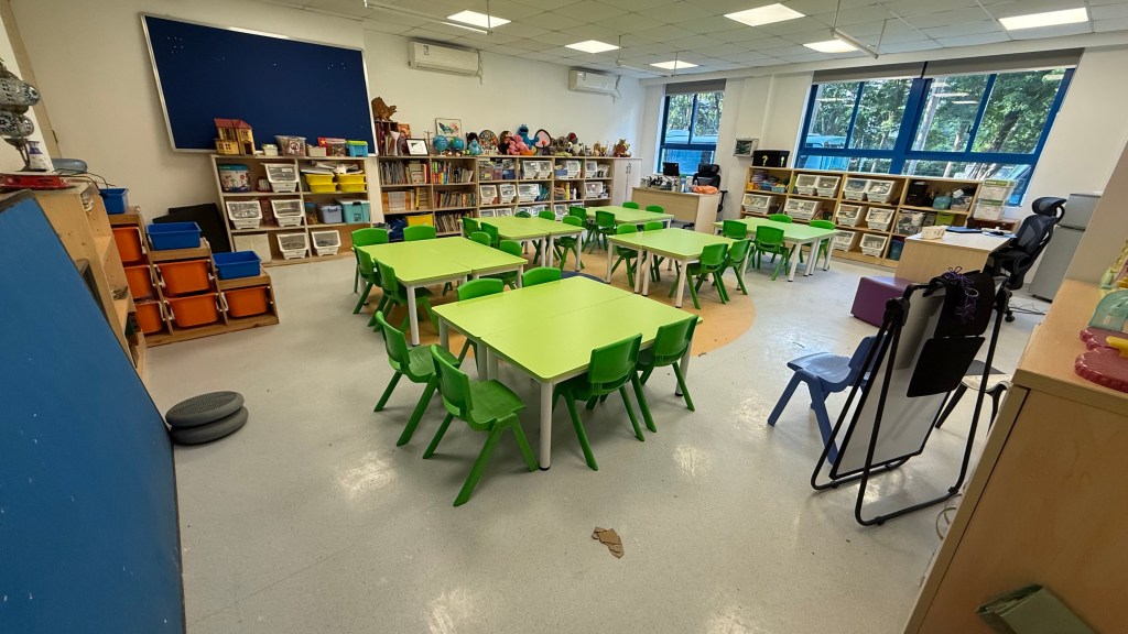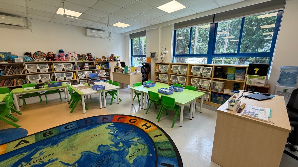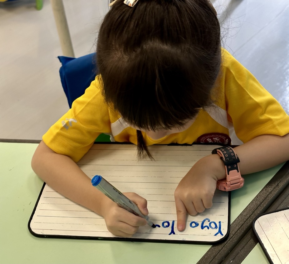 Our classroom is big and welcoming. There is plenty of space for the students to move around as they need. At the center of the classroom, there is the carpet area where most of our discussions and whole class activities occur. It also works as a stage for role plays and dancing. The tables are arranged for small group work which facilitates communnication and collaboration among students. Each student has a personal bag hanging at the back of their chairs where they keep their notebooks, miniboards and marker pens. The stationary that they use more frequently usually goes on the table, while the rest is insde the cupboard accessible to all. A big space, colourful furniture and resources make our classroom a cozy and safe place where my students to play and learn together.